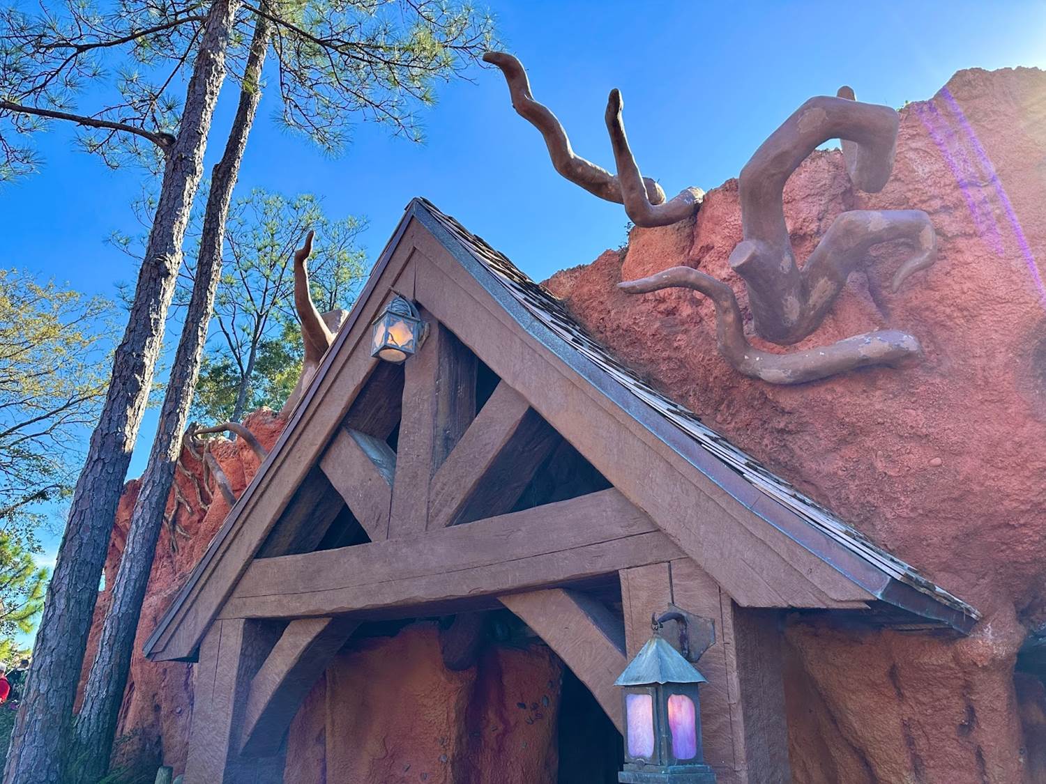 Around the side of the attraction near the former Briar Patch gift shop, many of the thorns remain, along with the previous color scheme of the rock work.