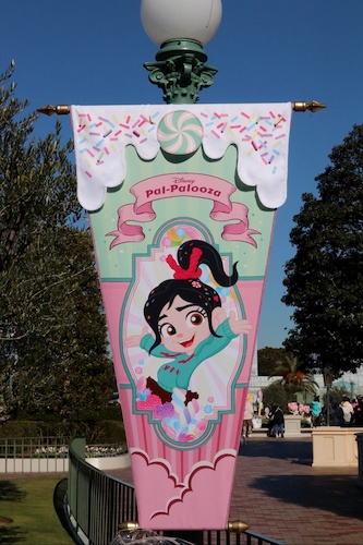 Upon entering the park, guests are immediately greeted with colorful decorations featuring Vanellope von Schweetz from Wreck-It Ralph.
