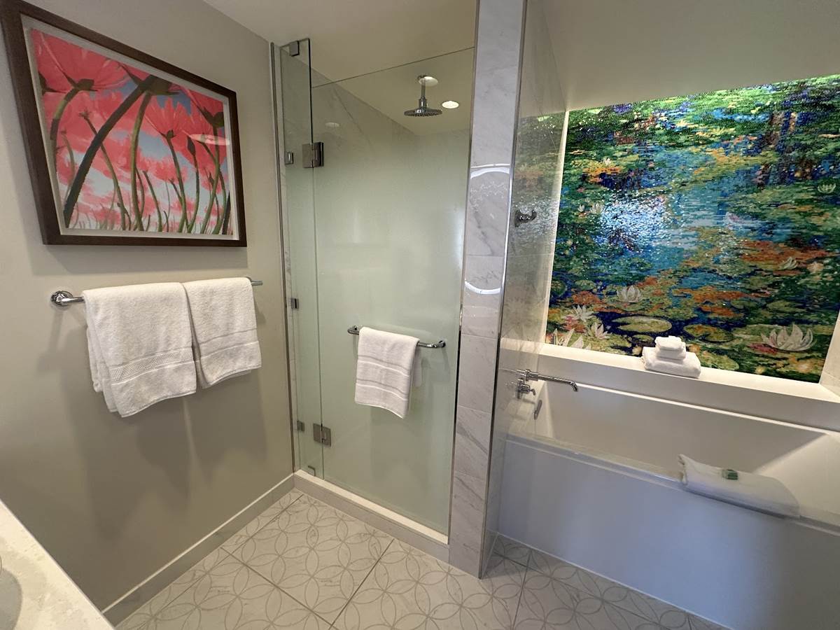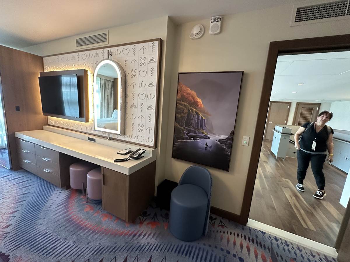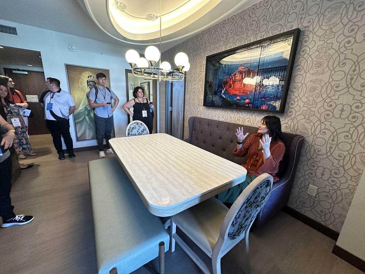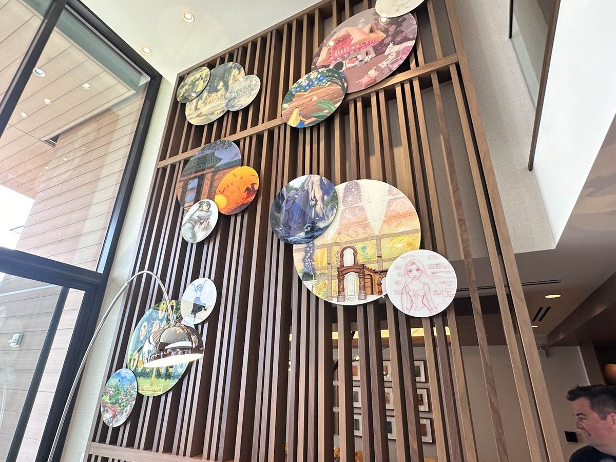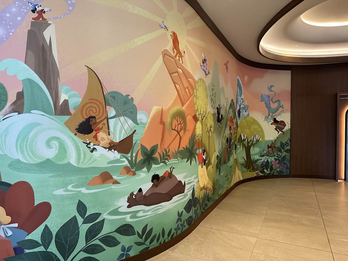 When entering the lobby, members and guests are greeted by a mural created exclusively for this property by beloved Disney Animation artist Lorelay Bové. Bové is known for her visual development work on Walt Disney Animation Studios films such as The Princess and the Frog and Encanto.