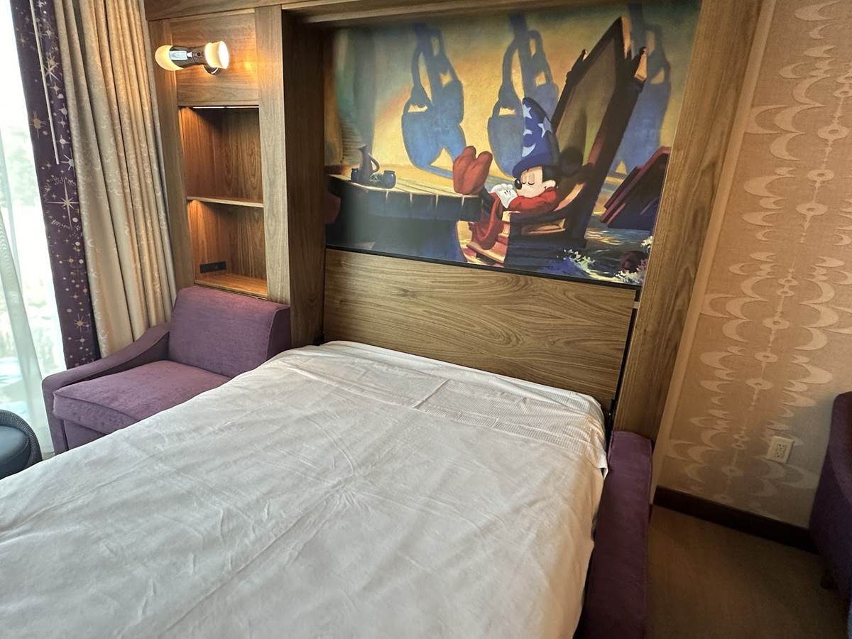 One- and two-bedroom villas offer roomier accommodations for larger families, sleeping up to five and nine guests, respectively. The villas include a full-size kitchen and living areas with comfortable sofa seating that can be easily pulled down to reveal a queen-size bed, complete with a story-themed mural above inspired by The Princess and the Frog or Fantasia. The comfort continues into the main bedroom, which includes a spacious en-suite bathroom featuring double vanities, a soaking tub with a themed mosaic-style tile mural and a spa-like shower.