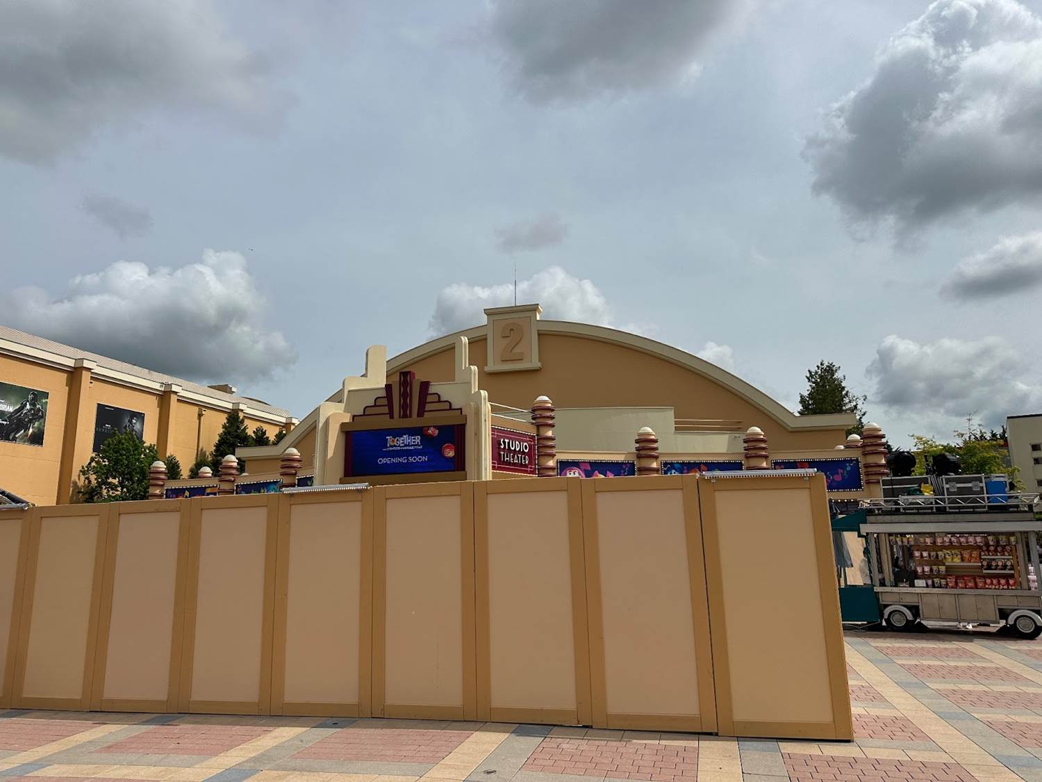 The entrance to Studio 1 is blocked off by a series of construction walls, featuring concept art for some of the various changes coming to the soon-to-be renamed Disney Adventure World.