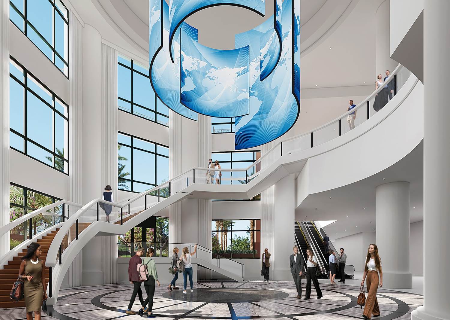 - The new entry will feature an open atrium, featuring natural light from floor-to-ceiling windows, complete with a winding staircase and two-story chandelier.