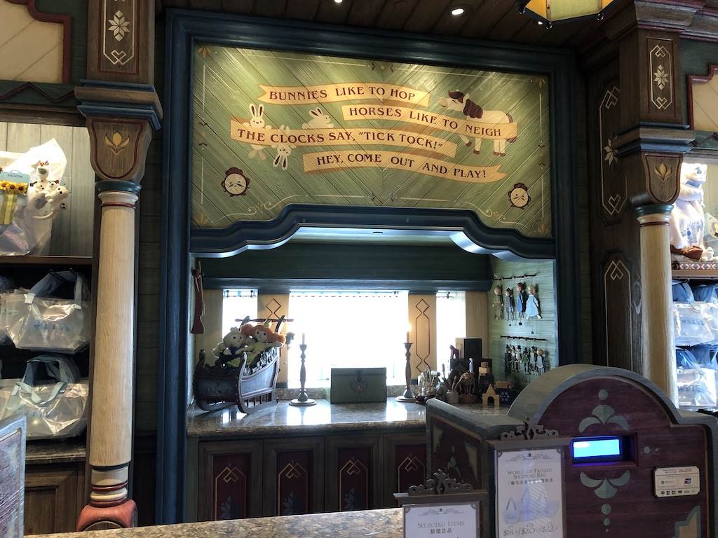 At the registers, guests will see a large display of merchandise in a translucent World of Frozen bag (available for purchase) highlighting some of the most popular items in the store. Also around the checkout are pictures of a toymaker hard at work and sculpted dolls.
