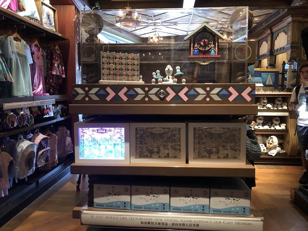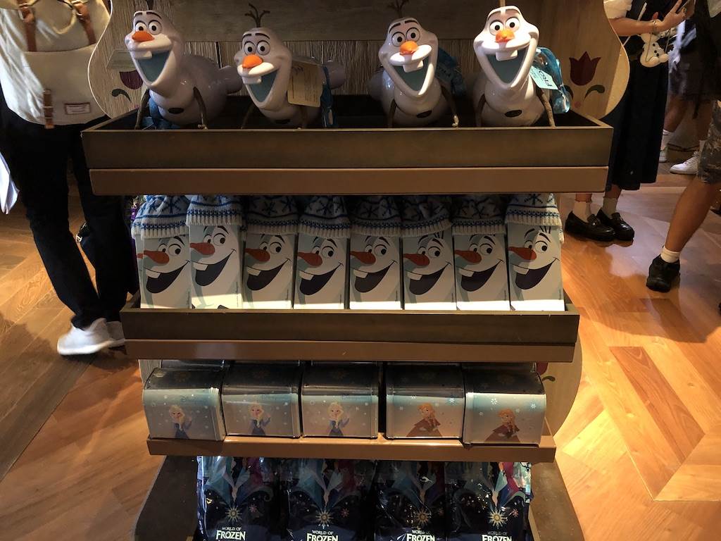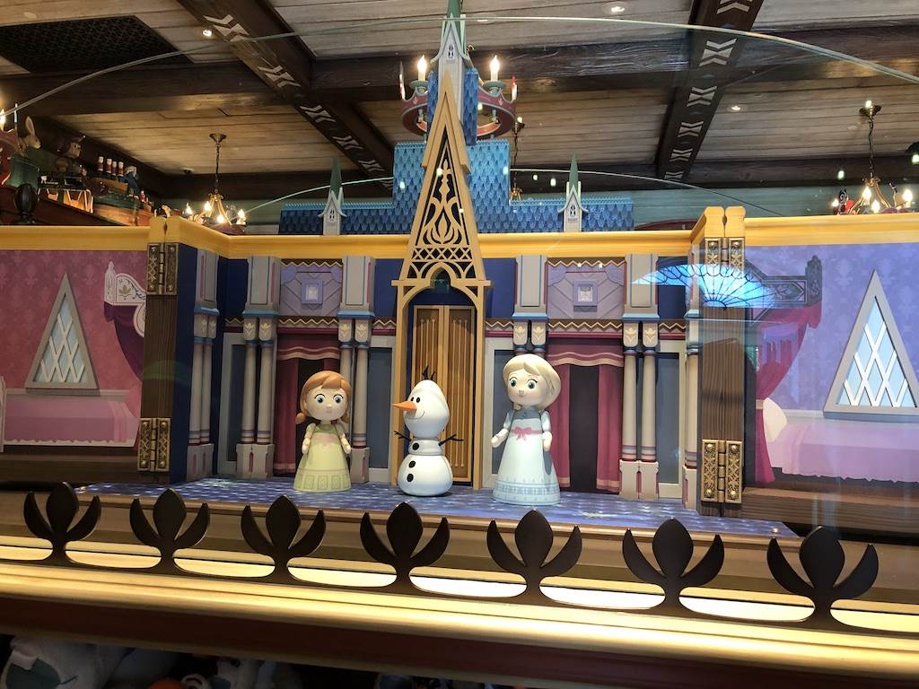When you walk into the store through the main entrance, you’ll be greeted by spinning racks on the left hand side, but just a bit further in is this incredible Arendelle castle toy display encased in glass. It features the wooden doll versions of the sisters as children along with their snowman pal, Olaf.