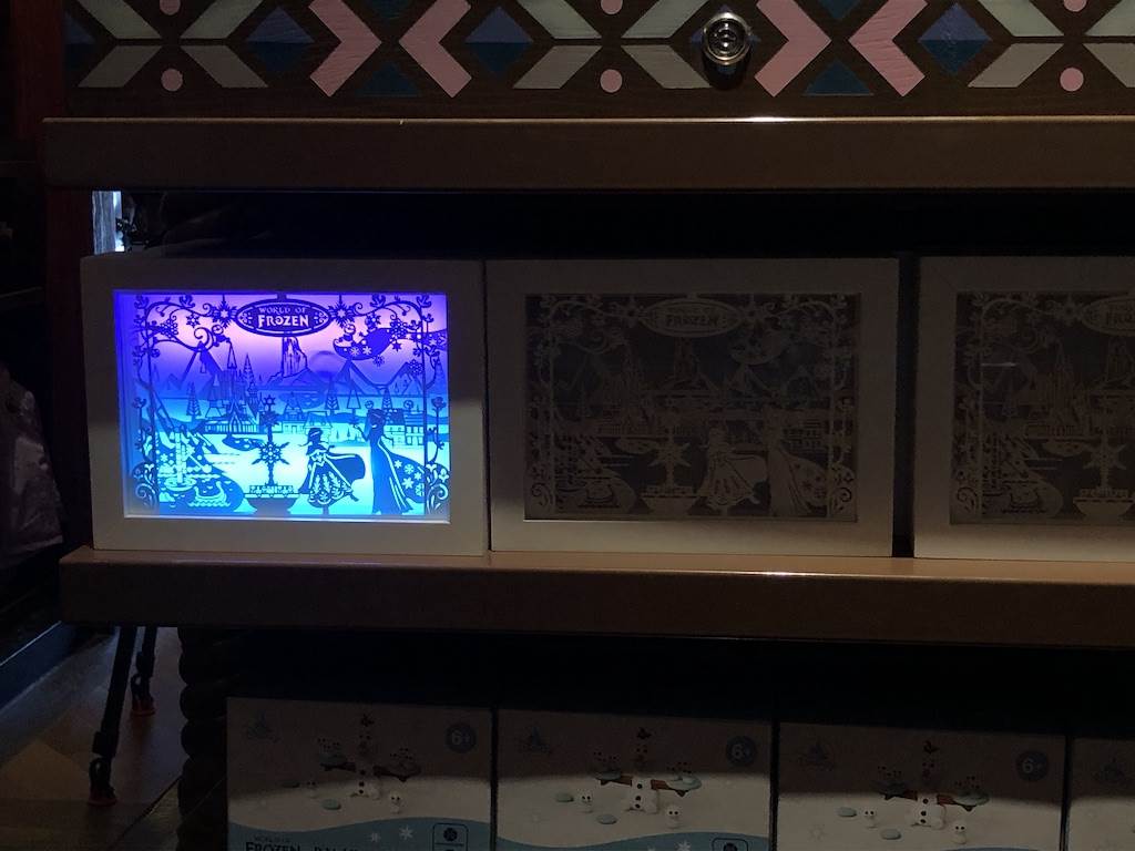 A light up shadow box recreates the World of Frozen and embellishes the land with glowing purple, blue, and green lights.