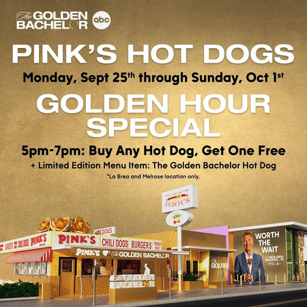 - An LA food staple, Pink's Hot Dogs will offer a limited-edition hot dog (2 dogs in 1 bun!) and Golden Hour special from 5-7 p.m. daily P.S. You may spot a familiar face on their famous wall of celebrities!