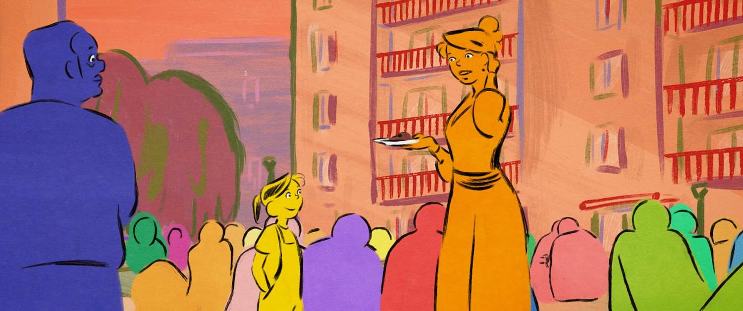 The film has a striking look to it–in a distinct contrast to the majority of animated features nowadays that all seem to make everything as photorealistic as possible, directors Chiara Malta and Sébastien Laudenbach have created it hand-painted and stylized so that only the pertinent details are ever present to highlight what is important. Each major character has a different primary color, giving the impression of a naturally multicultural community. The linework is sharp and distinct and gives the characters a fluidity and expressiveness they could never have in live-action.
