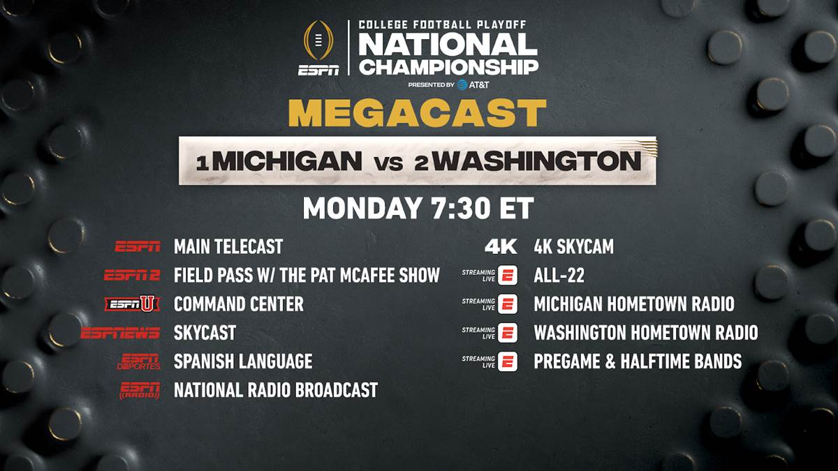 - ESPN’s main telecast will headline the signature MegaCast production, as ESPN offers 11 different presentations of the CFP National Championship Game across ESPN platforms. College football’s dramatic finale features a battle of undefeated teams and will be available in more than 160 countries courtesy of ESPN’s linear and digital platforms.