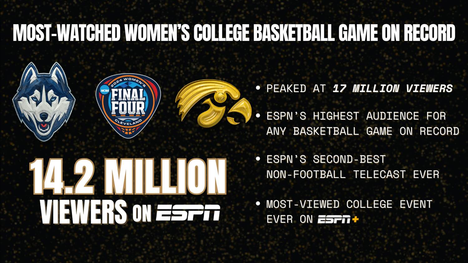 The NCAA Semifinals on ESPN has shattered viewership records, with the UConn-Iowa game seeing 14.2 million viewers, and Friday’s NCAA Women’s Final Four with an average audience of 10.8 million.