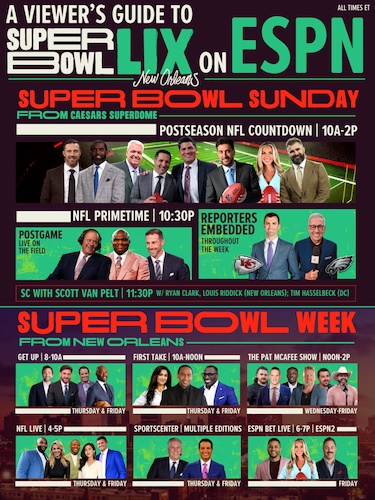 - ESPN is headed to Super Bowl LIX in New Orleans, with many of the network’s shows originating from the Crescent City leading up to, and on, Super Bowl Sunday. ESPN hosts, analysts, insiders, reporters, writers and more, will blanket NOLA for coverage populating ESPN’s many platforms 24-hours-a-day leading up to the Kansas City Chiefs and Philadelphia Eagles contest. ESPN’s onsite presence at America’s biggest game is one of the company’s longest standing traditions.