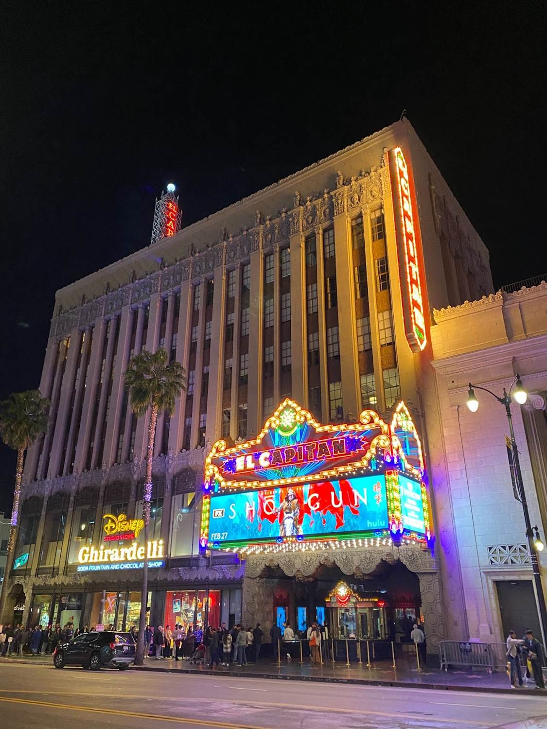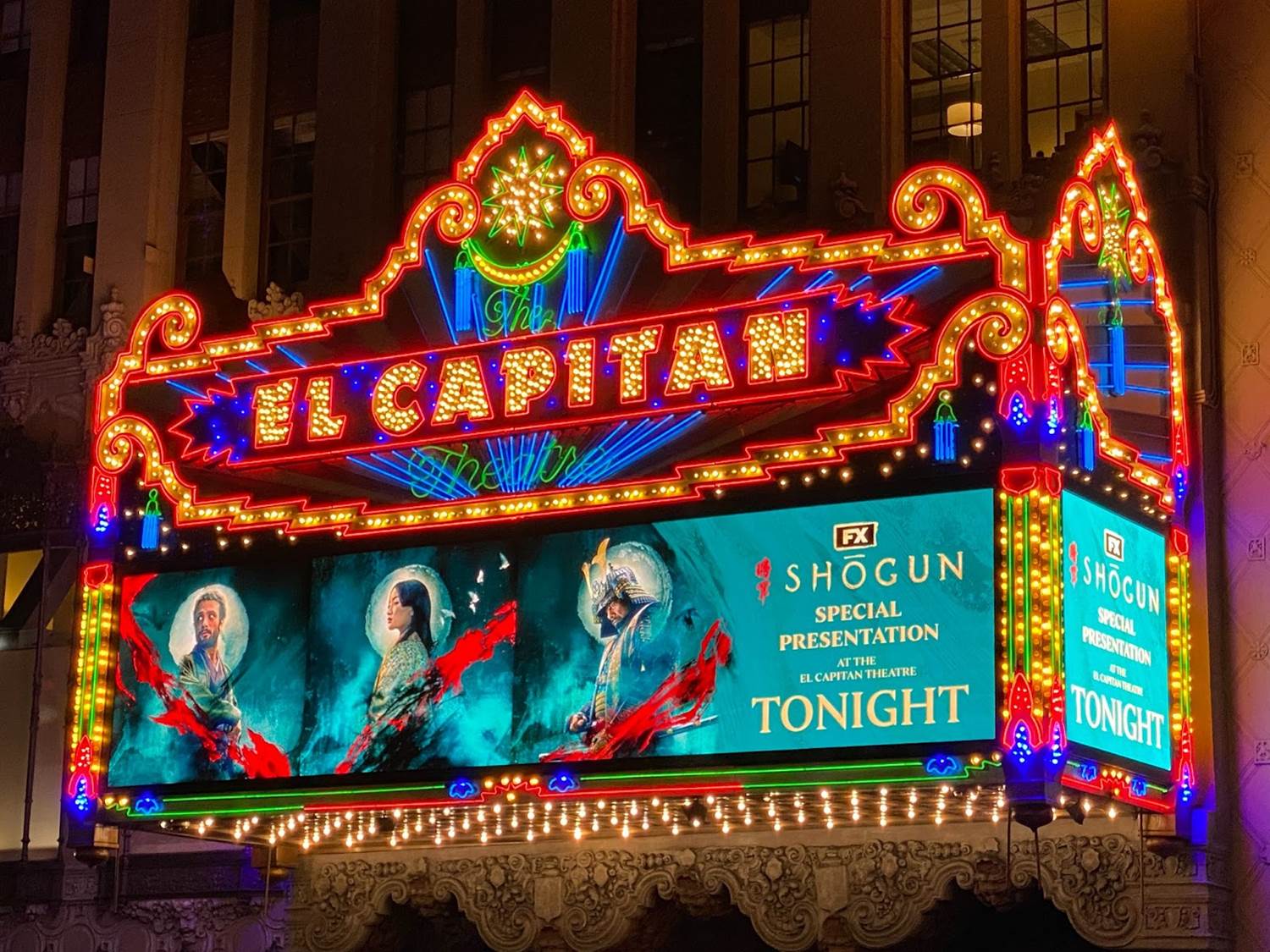 Rewinding time an hour or so, it was cool to arrive at El Capitan Theatre on Hollywood Boulevard and see the famous movie house’s marquee lit up with the Shogun key art. The interior of the theater’s lobby was decorated for the occasion with electronic posters for the miniseries as well.