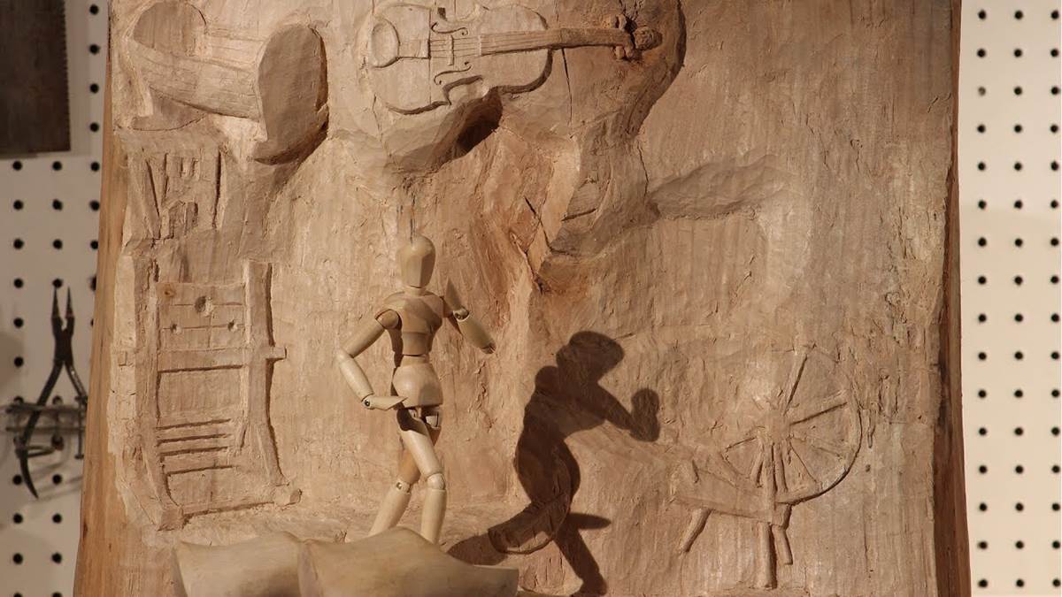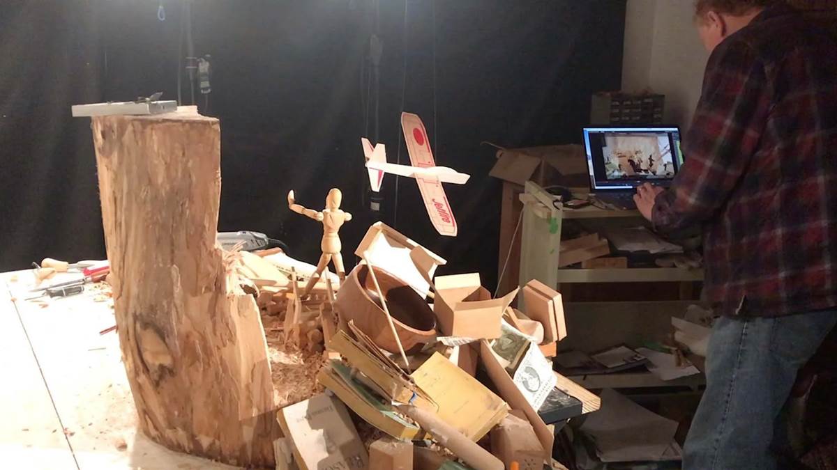 At certain points throughout the short film, wooden objects slide or fly out of the wood, like Lincoln Logs and even an artist’s mannequin. For this, Klatte had special rigs set up that would be edited out in post. However, he had a wooden carving that serves as the background, so while rods and strings were holding up the objects, Klatte still needed the background template for editing. As such, he had to painstakingly take the template frame, reset the foreground and all the supports and rigs for that frame, and to make his next carving, do it all over again.