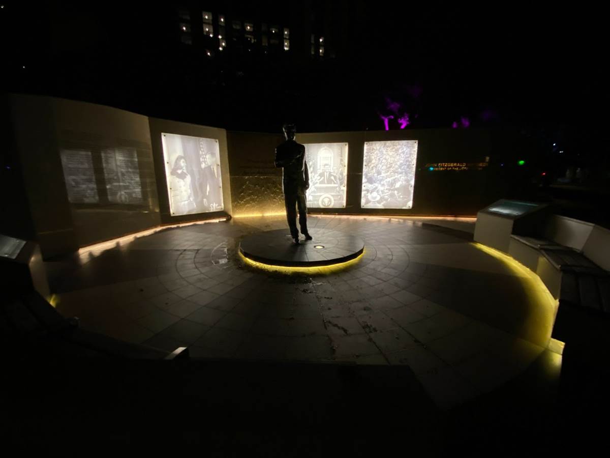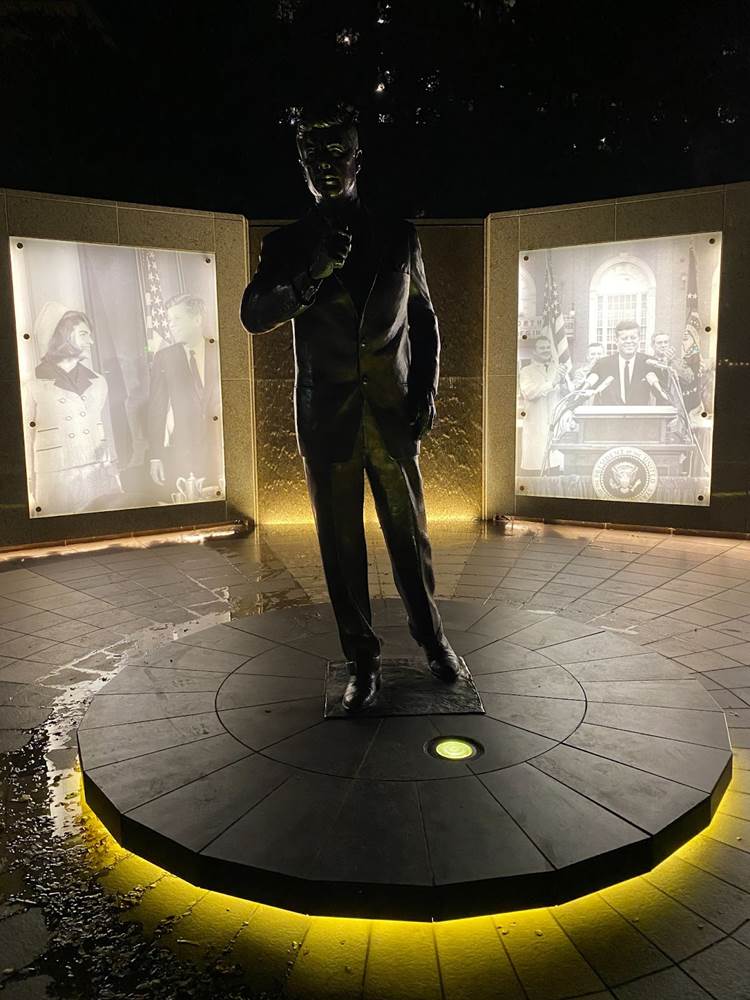 Our welcome dinner that evening was held at the Grace Fort Worth restaurant, just down the block from the Hilton. There, we met our fellow journalists and influencers who would be joining us on this trip and heard from the producers of JFK: One Day In America about their intentions with this new National Geographic documentary. We also met and interacted with Peggy Simpson, a reporter with the Associated Press in the 60s, who saw JFK’s motorcade that day and witnessed first-hand Jack Ruby’s slaying of Lee Harvey Oswald two days later. As someone who grew up fascinated by the events surrounding the JFK assassination, it was truly an honor to be in her presence (photo with Peggy from the following day at Dealey Plaza). After dinner, I went by the JFK statue again to see what it looked like lit up at nighttime.
