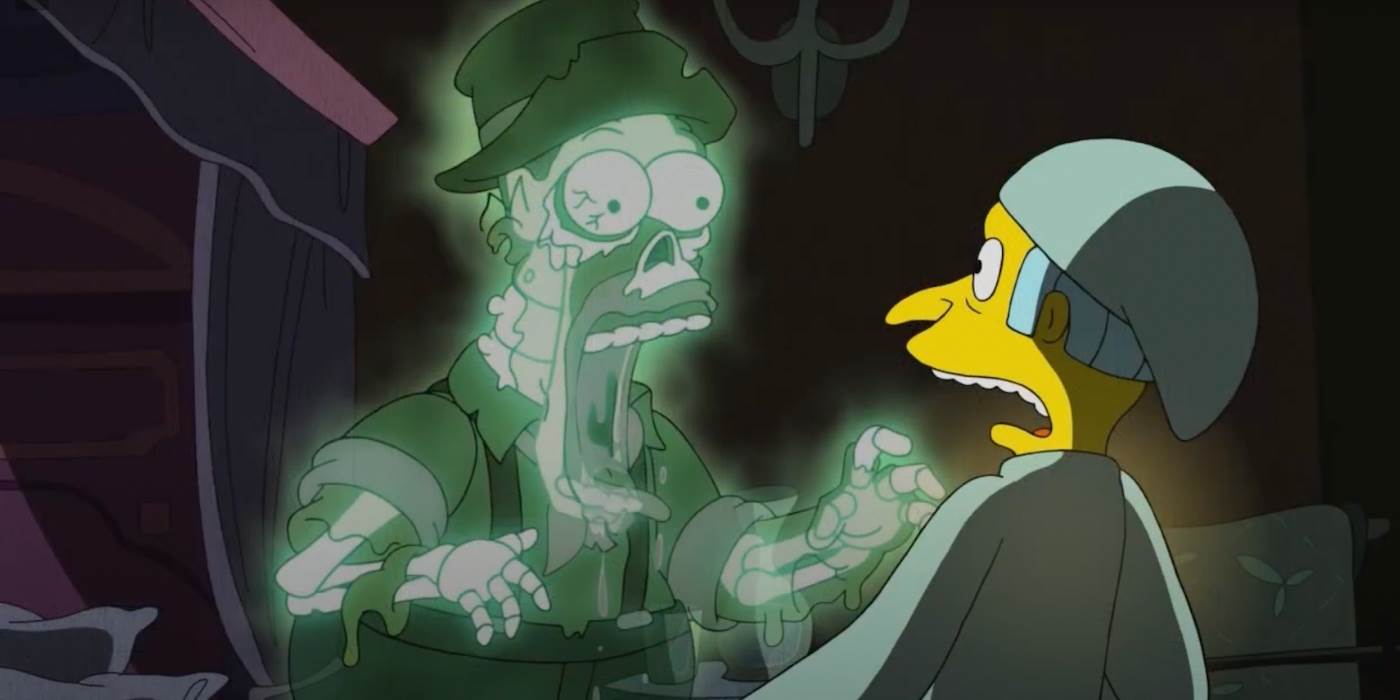 Burns’s wife Agnes Skinner (Tress MacNeille) warns Monty that he is now cursed by breaking his wishbone promise, and will be tormented by the souls of all he has wronged, “‘til the end of your days." “Now I remember why I married you," remarks Burns, and the two geriatrics begin furiously making out. (Note: this is coincidentally the second Simpsons episode in a row in which Mr. Burns and Agnes Skinner are or were in a relationship). The next day at the factory, Homer tries to eat some of the boiling-hot corn syrup and instead causes an accident that kills himself and all the other workers. As predicted by Agnes, the ghosts of these employees begin to haunt Burns immediately, many of whom keep yelling “Jump scare!" at him as he runs around the mansion attempting to evade his fate. Much like in the Winchester house, some doors lead to dead ends, and others down long, twisting corridors, but Burns cannot shake the ghosts, who even scare themselves. Monty decides he can end the curse by providing the undead workers with the dinner he had promised them, but after riding down an elevator inspired by Disneyland’s Haunted Mansion and preparing a meal in the kitchen, the ghosts pass right through the food, turning it rotten and maggot-ridden.