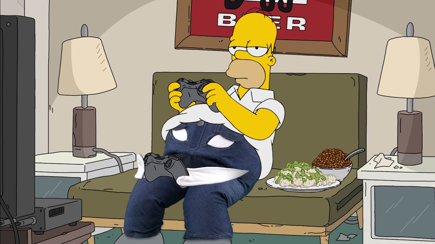 So Homer and Marge enter into a relationship without him ever taking off his new jeans, practicing “outercourse" instead of the usual love-making rituals. But in private Marge complains to her sisters Patty and Selma (also Kavner), who demand that he “drop jeans and fulfill your dreams." When the couple moves in together, Homer attempts to tell Marge the truth, but Denim won’t allow it, making Homer walk out of the room instead. At Moe’s Tavern, Denim tells Homer that Marge is “attempting to break up a great team," but Homer attempts to end his relationship with the symbiote. “No one will ever flatter your ass like I do," begs Denim, but Homer quiets the creature by getting them both drunk and passing out. The next day he wakes up to Marge having surreptitiously replaced the jeans with a pair of khakis and having put Denim in the washing machine.