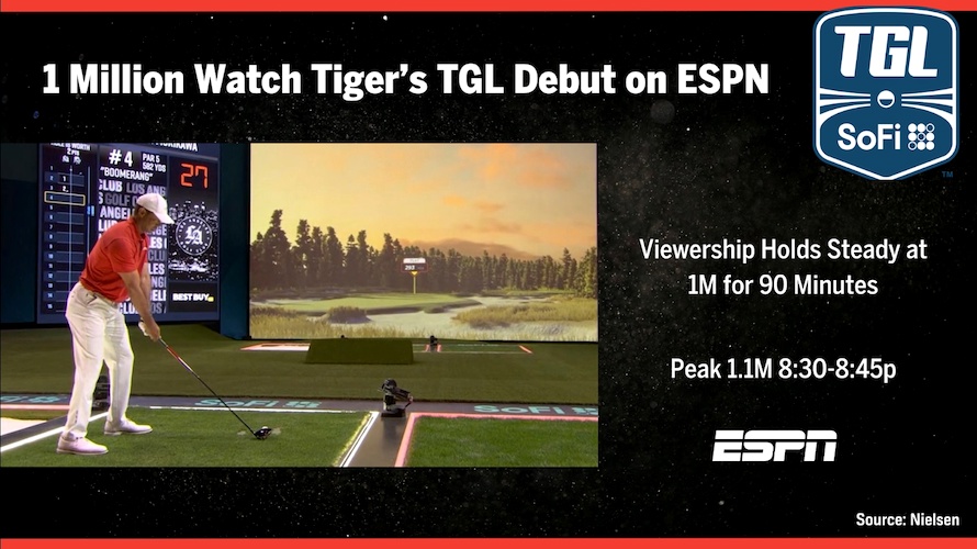 Viewership for Tiger Woods’ debut match in the new TGL presented by SoFi, peaked at 1.1 million, and held steady for 90 Minutes.