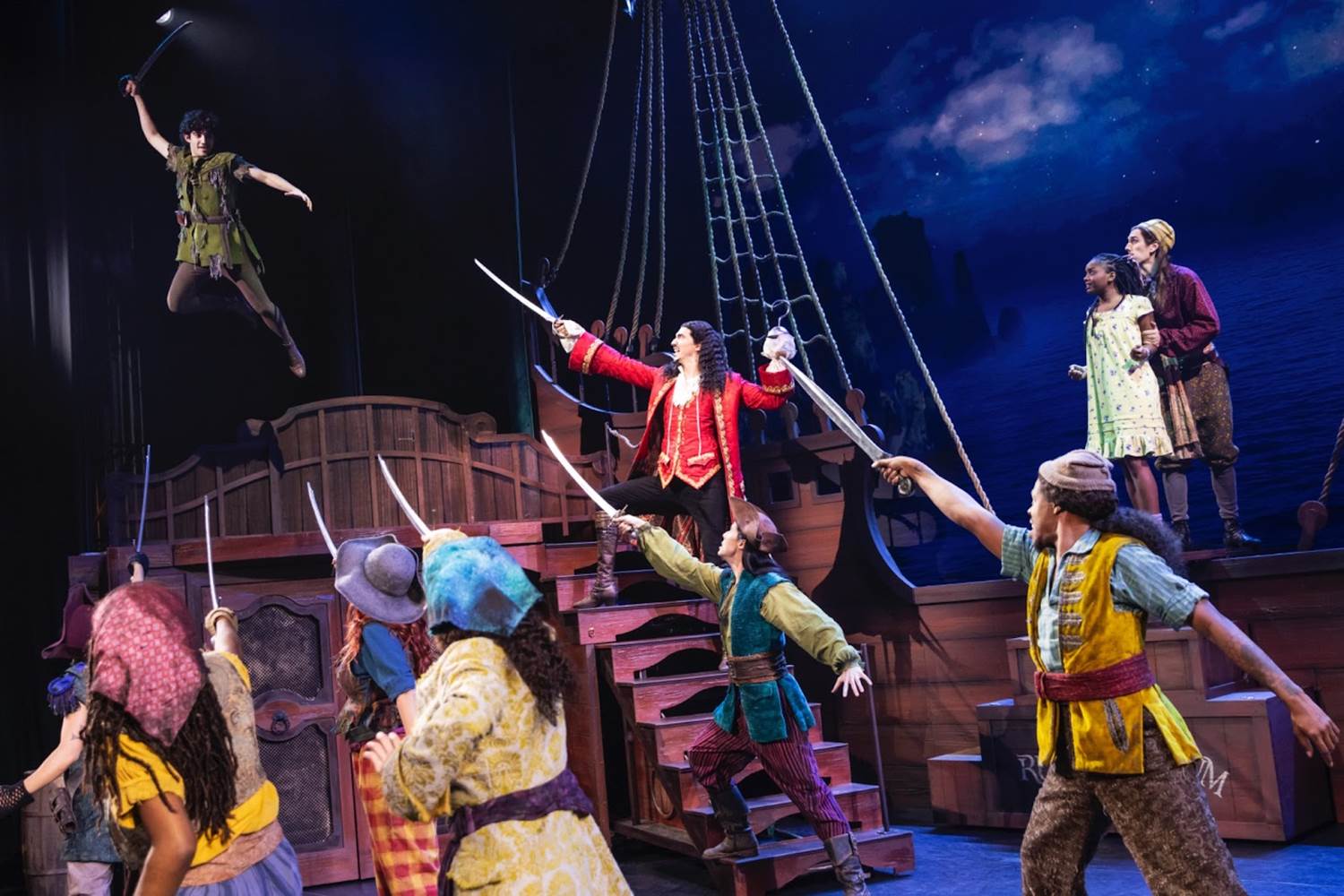 Peter, Wendy, and all the younger cast do such an amazing job that it is hard to think that this is many of their first tours. But, truly, Nolan Almeida (as the title role of Peter) and Hawa Kamara (as Wendy) truly own the stage and sky with amazing emotion and stunning wire work as they fly about and exchange “kisses.".