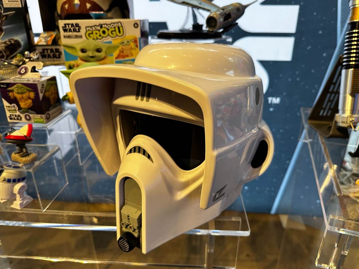 Closing out Hasbro’s Star Wars display is The Black Series Scout Trooper Premium Electronic Helmet (Ages 14 and up, MSRP: $131.99). Inspired by Return of the Jedi, this wearable collectible features an electronic voice distortion effect (utilizing 1 AAA battery, not included) in addition to screen-accurate details.