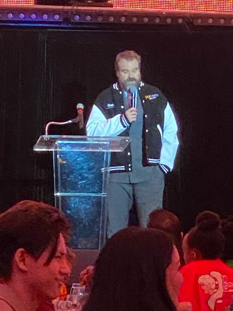 Next it was time for this year’s BoxLunch Giving Ambassador David Harbour to take the stage, presenting two enormous $100,000 checks to Feeding America’s Jennifer Polk.