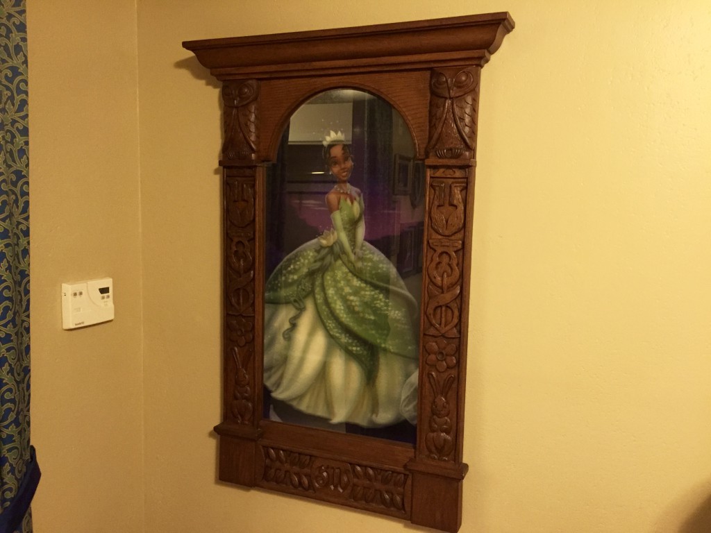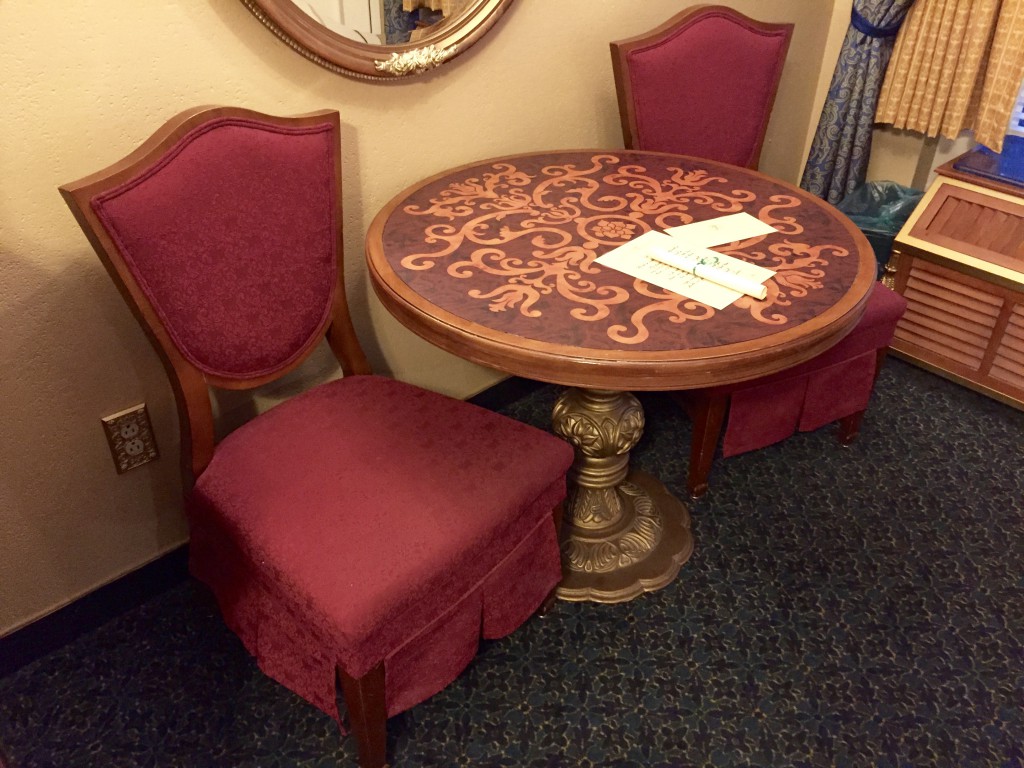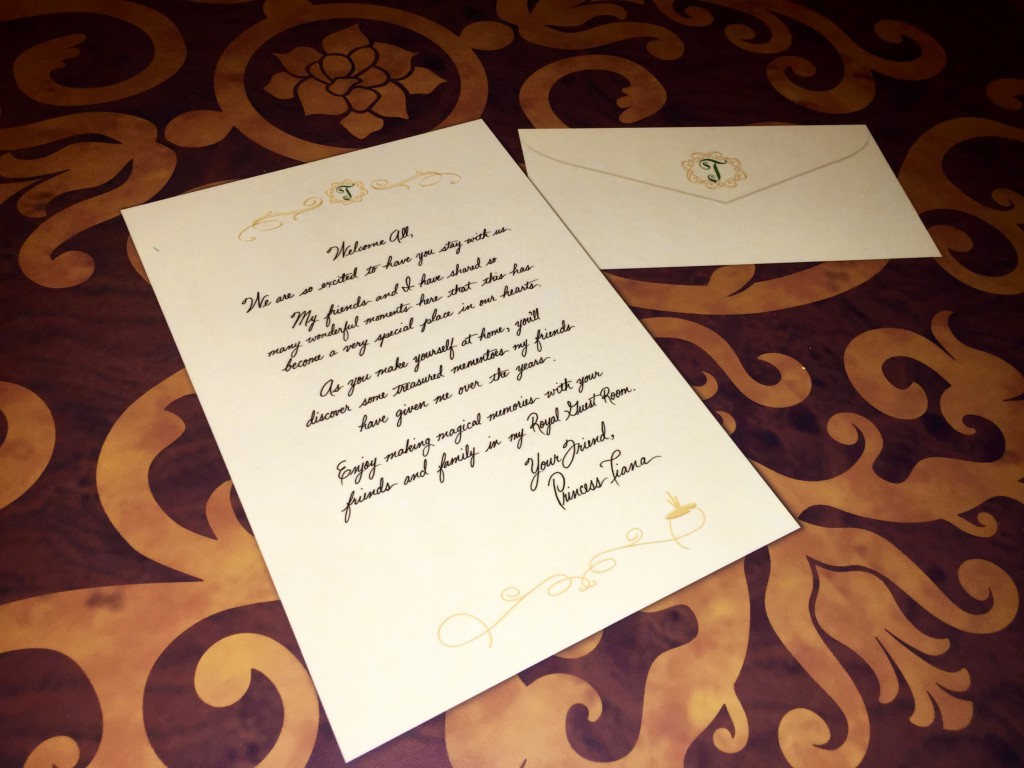 The room is set up just as a standard Disney room with a table and chairs, with the exception to the Royal welcome from Princess Tiana embedded in the table.