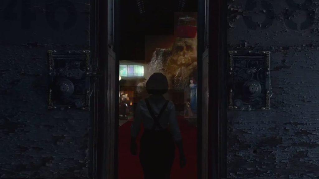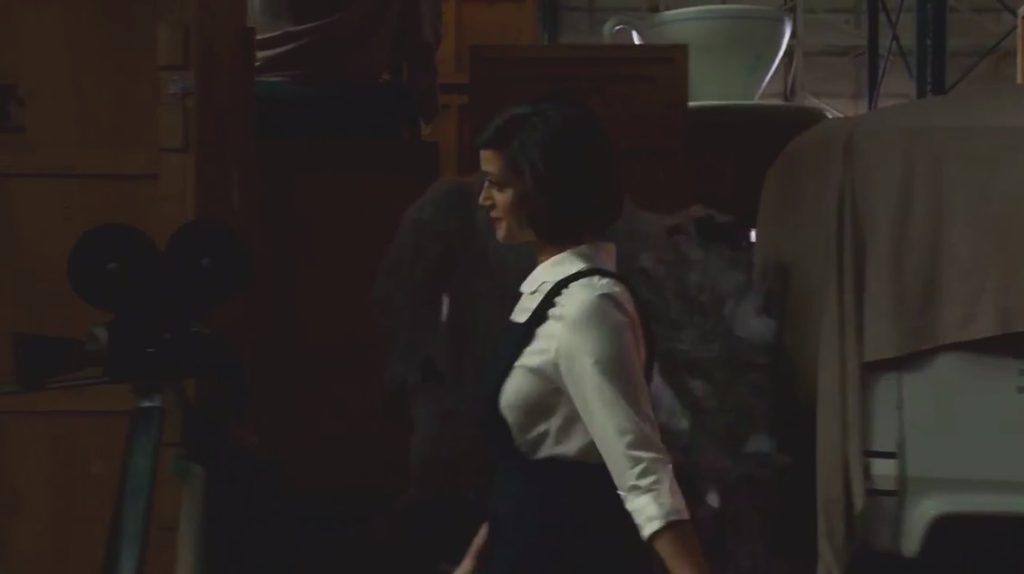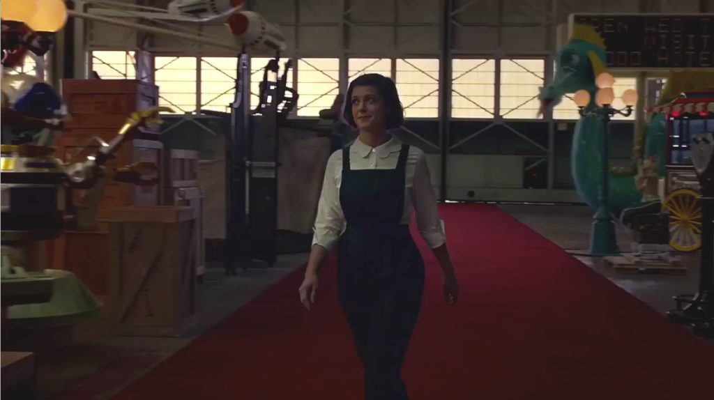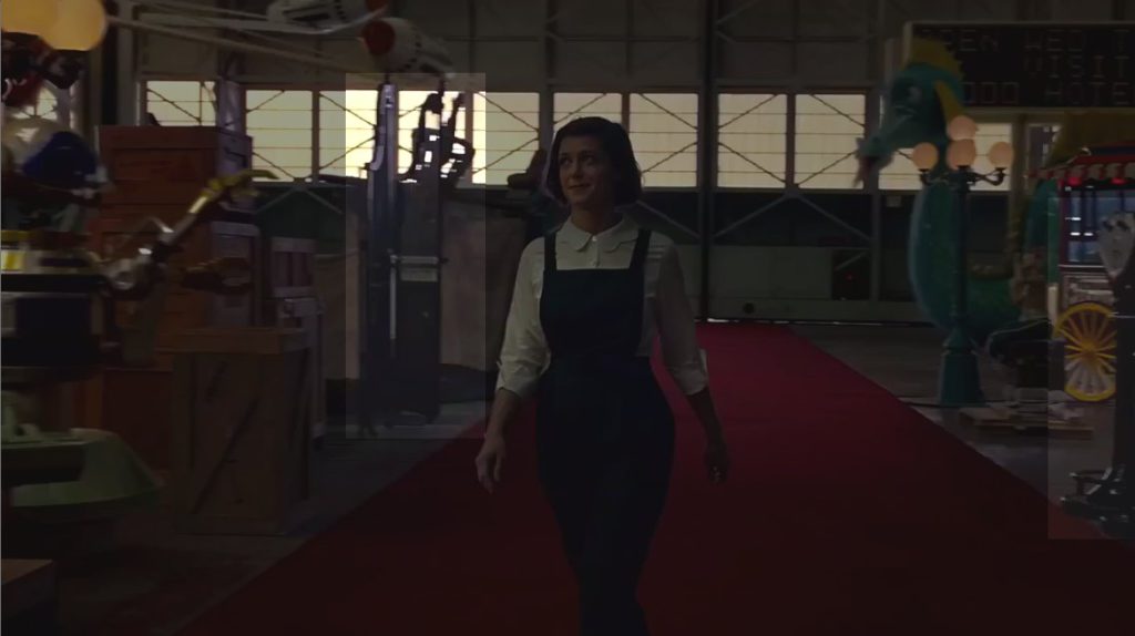 Just after four seconds the point of view shifts to the floor level. As the cast member strides down the carpet, we see a pair of doors or panels to her left (more on those below), and on the far right of the screen an old-fashioned coin-operated binocular.