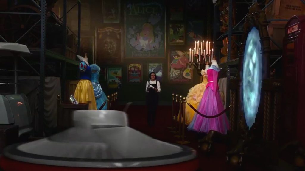 On the left of the screen can be seen Snow White’s gown, Cinderella’s gown, and a pair of her glass slippers. On the right are gowns for Belle and Sleeping Beauty (the pink one!). Also visible is a large candelabra (either from the loading area of the Haunted Mansion, or the ballroom sequence in the Christmas Fantasy Parade), a heavily framed magic mirror, and a properly British telephone booth. The Disneyland Hotel once featured a red booth for pay phones, and one also was “stored” in the Hollywood Picture Backlot in Disney California Adventure.