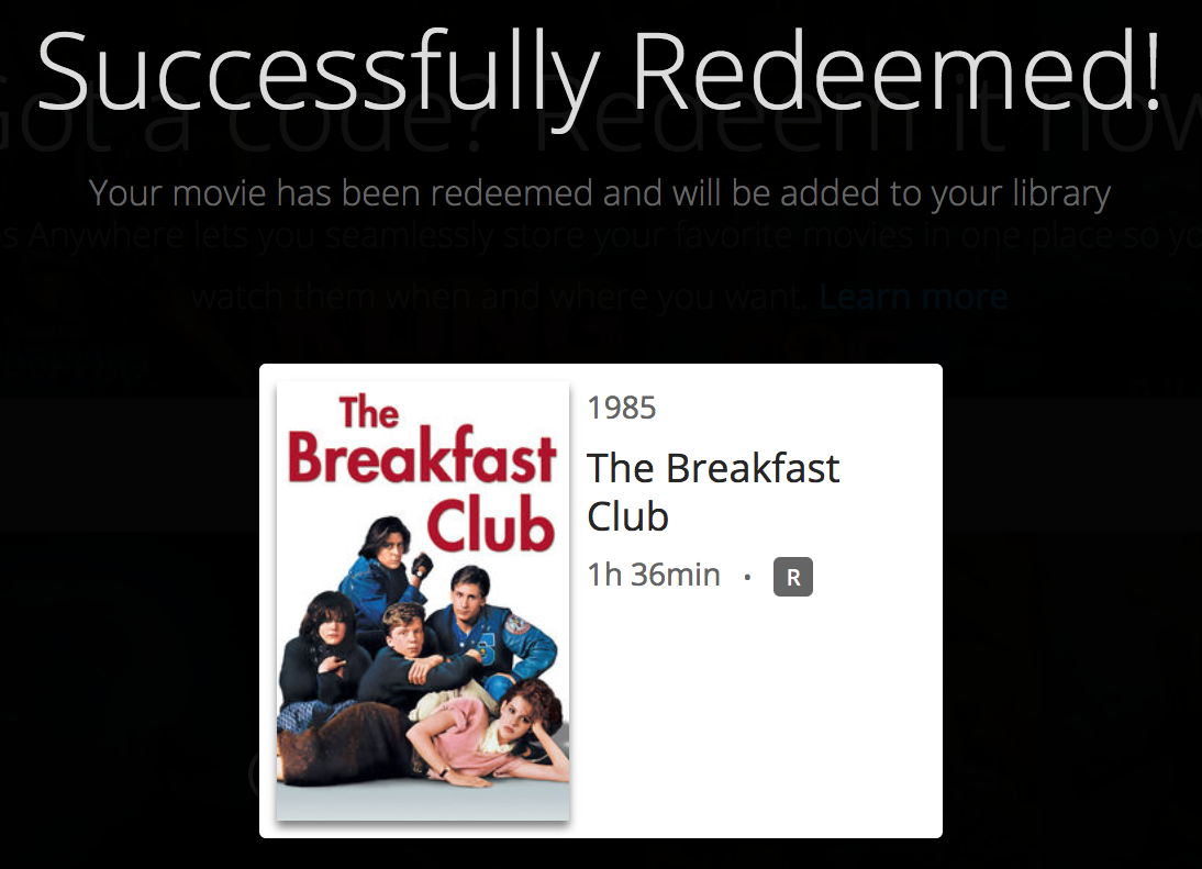 We Disney fans take for granted how easy it's always been to redeem a digital copy. Anyone whose ever tried to redeem one through Ultra-Violet or Universal's own confusing system will appreciate the fact that you can now enter your code directly into Movies Anywhere and it automatically links to all connected accounts. I tested this feature with The Breakfast Club, a Universal film I've owned for a while and avoided redeeming the code simply because I didn't want to deal with the unnecessary steps Universal used to require. Now I just need to grab all of my unredeemed codes from these other studios and dump them into Movies Anywhere.
