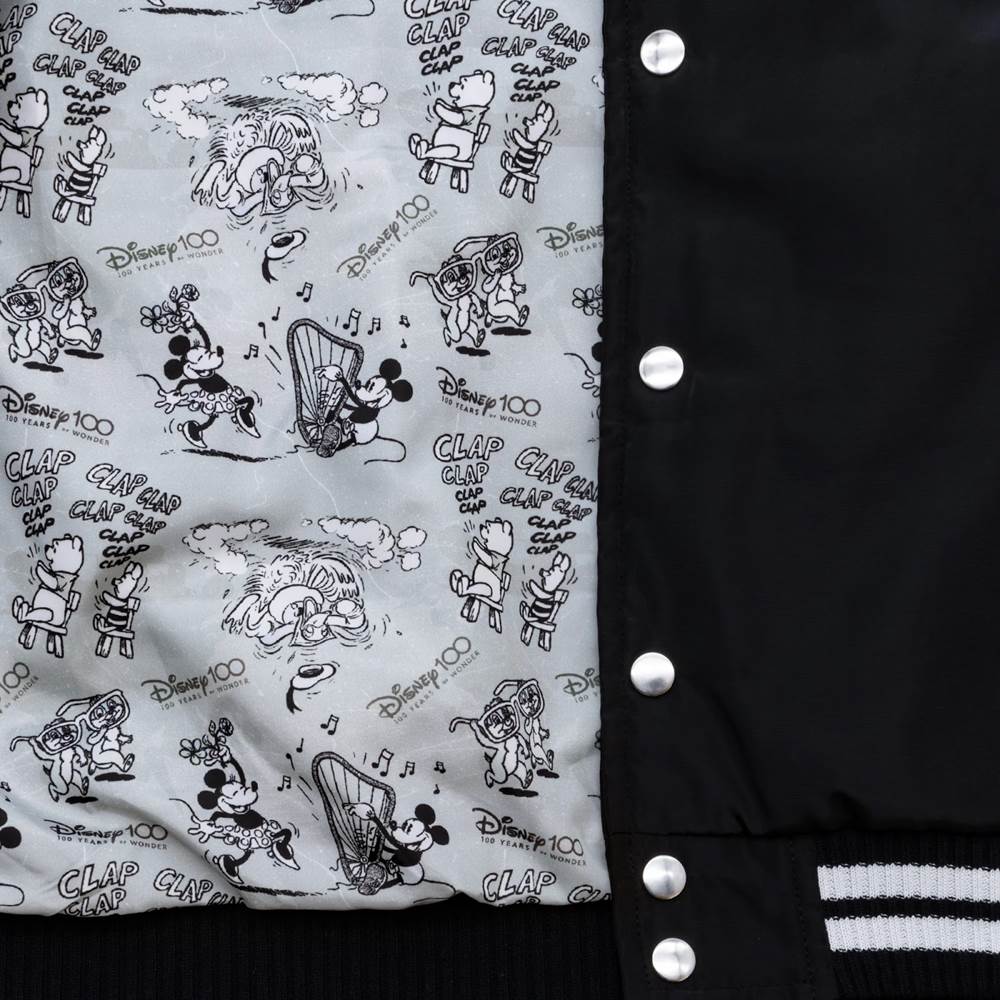 - One of the standout pieces in this box is the bomber jacket that features a Mickey Mouse patch on the right shoulder, D100 logo on the left chest, and Disney “D" surrounded by character silhouettes on the back.
