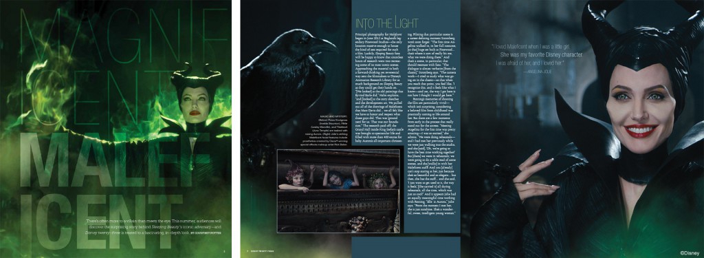 D23: The Official Disney Fan Club celebrates the upcoming release of the eagerly anticipated Maleficent in the summer publication Disney twenty-three. Angelina Jolie and the creative team pull back the curtain on the surprising tale behind one of Disney’s most iconic villains. “I was afraid of her, and I loved her,” Jolie confesses in the cover story. Accompanying the piece is an in-depth look by animation historian Charles Solomon at the development of Walt Disney’s 1959 creative masterpiece, Sleeping Beauty, with rarely seen concept art and drawings.