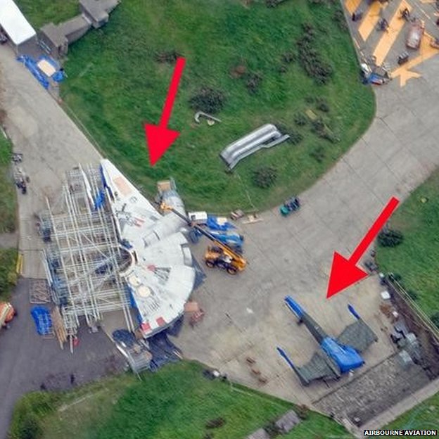 The BBC is reporting that a man who was taking publicity pictures for a flight school discovered that he had captured construction of a Millennium Falcon and X-Wing presumably being used for the production of Star Wars: Episode VII which is being filmed in the United Kingdom.
