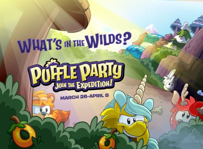 Join the expedition into the Wilds! An unexpected event at the new lodge creates excitement on Club Penguin island. PH's Puffle Guides were going to kick off the Puffle Party with a special celebration, but a mysterious creature has broken into the lodge, eaten their fish cake, and run off! On March 26, players can explore the untamed Wilds and quest to find out who - or what - caused this havoc. Members can adopt wild puffle creatures and earn special wild puffle-themed hoodies. Everyone can earn wild puffle hats. Check out the Puffle Party March 26-April 8.