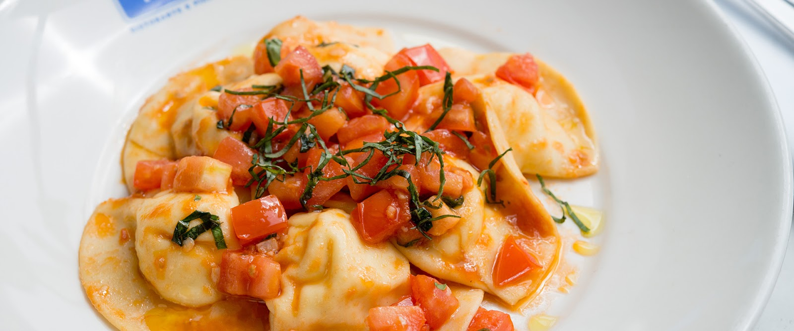 - Ravioli – Eggplant, scamorza cheese, ricotta cheese, fresh tomato, and basil sauce