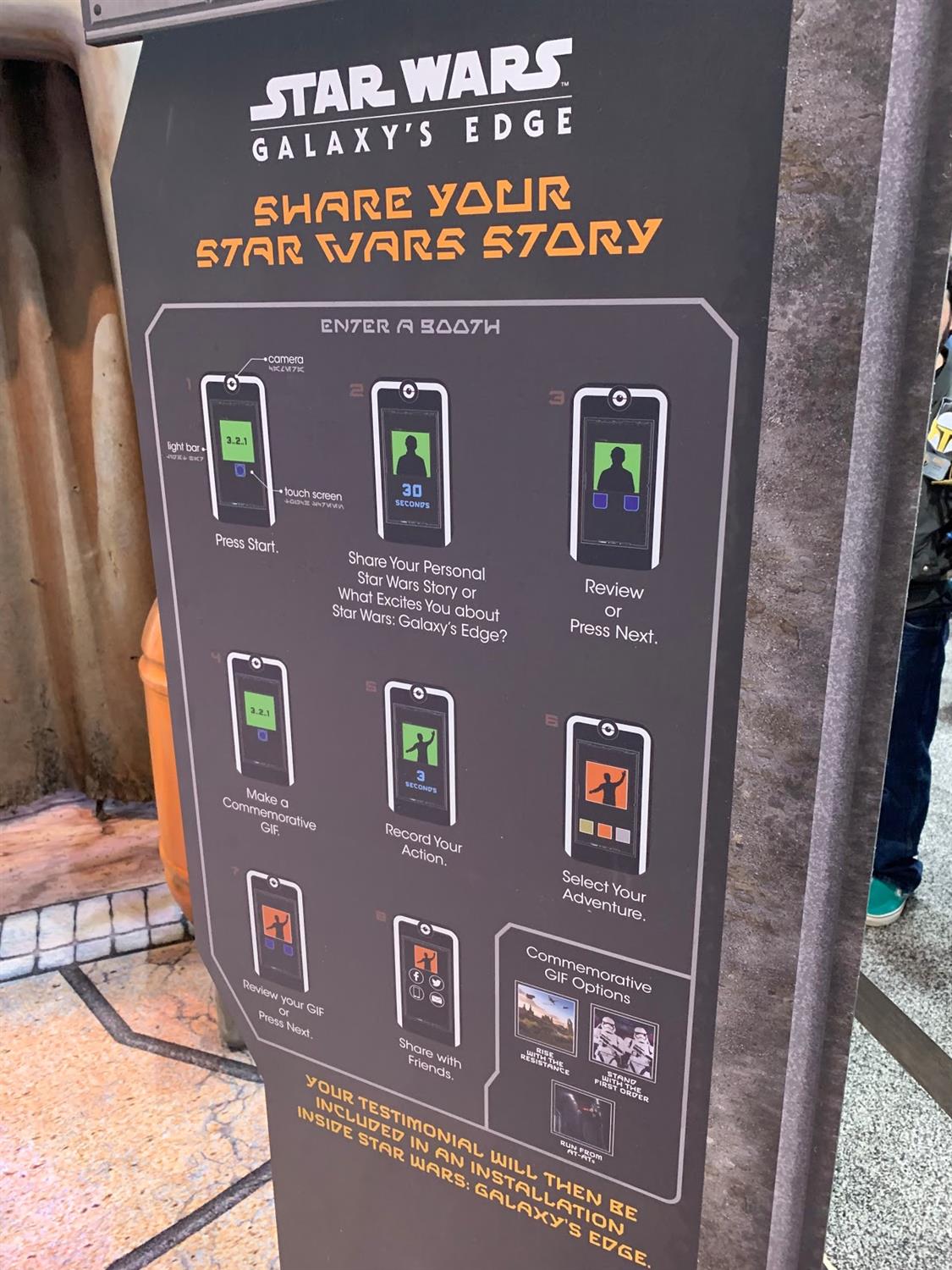 Guests visiting the booth can also share their Star Wars story by recording a video. Guest’s testimonials will then be used in an installation inside Star Wars: Galaxy’s Edge.