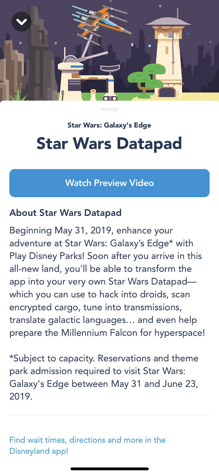- And by the way, the Disneyland Park page is not the only place in the app you can see this Star Wars: Galaxy’s Edge preview.
