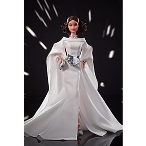 - This collectible Star Wars x Barbie doll captures Princess Leia’s iconic look in an elegant white gown with dramatic, floor-length sleeves. Details include a silvery peplum belt, cuff jewelry and an up-do inspired by her signature bun hairstyle.