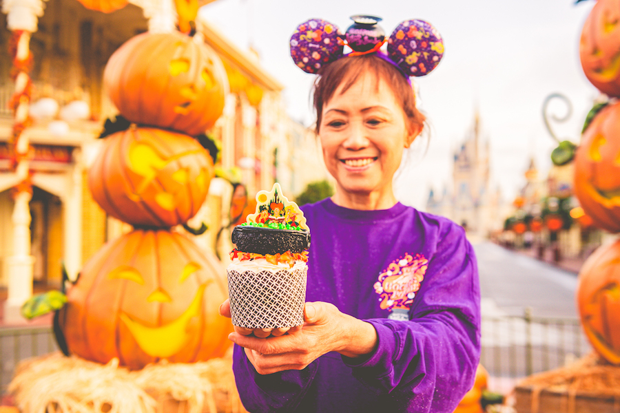 - Trick or treat candy cupcake (a cupcake baked peanut butter chips, chocolate candy bits, and toffee) filled with caramel sauce, topped with an edible cake “cauldron,” and chocolate buttercream and garnished with a white chocolate decoration featuring the Sanderson sisters.