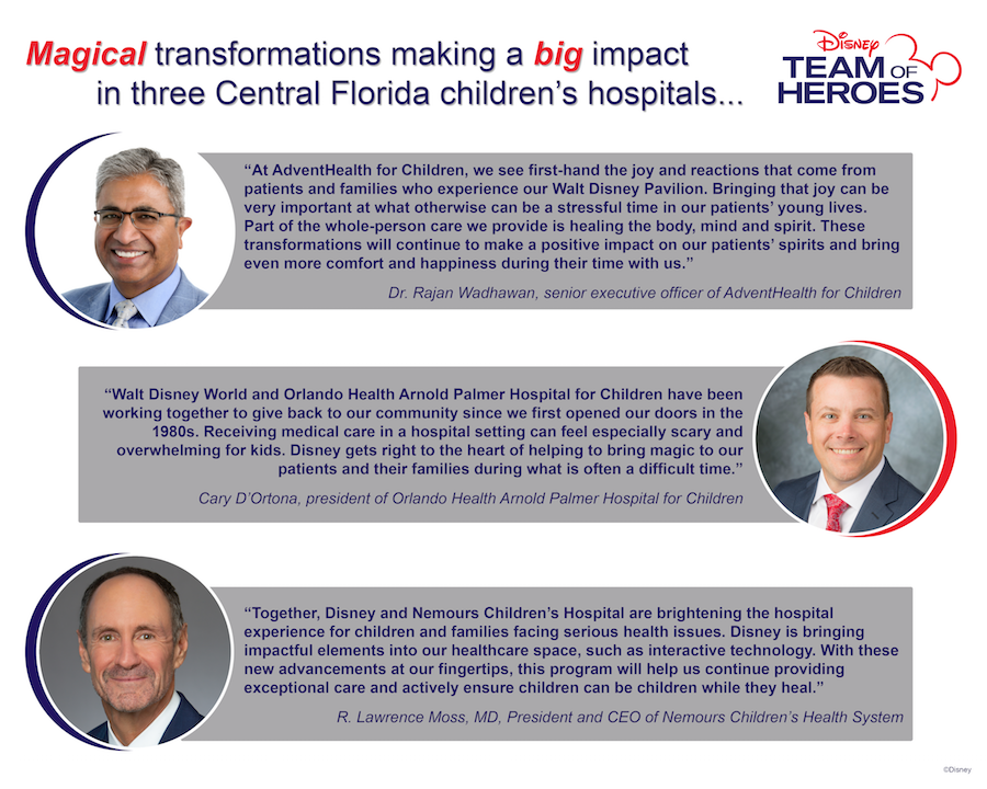 - The Walt Disney Company has announced three Central Florida hospitals will be the next recipients of Disney’s Team of Heroes philanthropic outreach program.