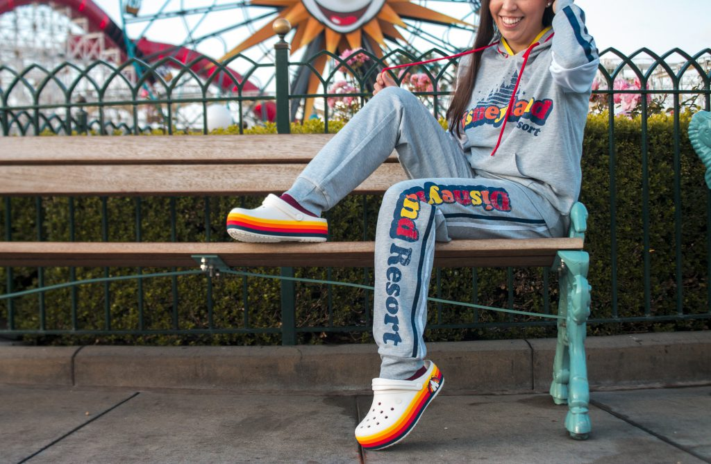 - Modern belongings can be carried in retro style with an adjustable crossbody bag, and that aforementioned sun can be kept out-of-sight with a Disneyland Resort or Walt Disney World Resort baseball hat. Top off the outfit with psychedelic platform Crocs.