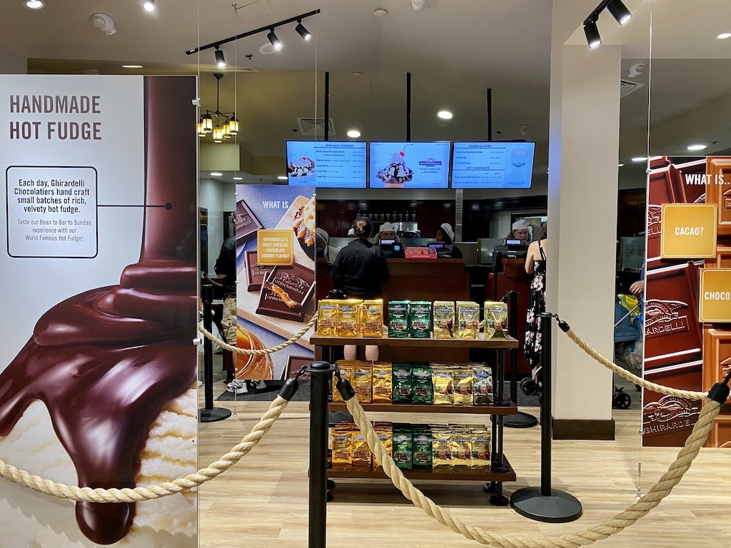 This new setup features grab and go displays with bags of Ghirardell’s famous chocolate squares that guests can purchase when ordering their speciality desserts. Additionally, new track lighting has been installed providing cool tones without being overly bright; and new wood panel flooring adds to the clean polished feel replacing the former soda fountain tiles.