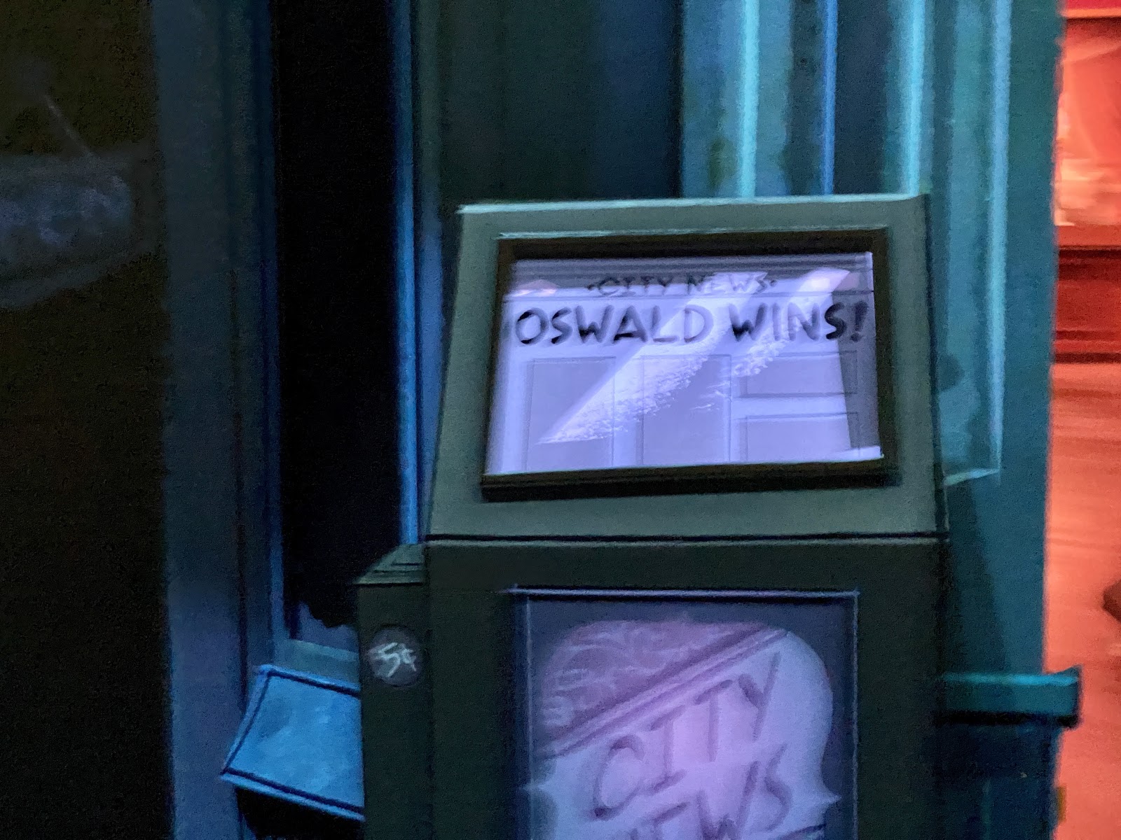 - A newspaper features the headline “Oswald Wins!” – a reference to Oswald the Lucky Rabbit, the cartoon character created by Walt Disney that predates Mickey Mouse.