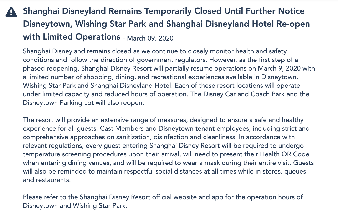 - Statement regarding partially reopening and safety measures posted to the Shanghai Disney Resort’s site: “The resort will provide an extensive range of measures, designed to ensure a safe and healthy experience for all guests, Cast Members and Disneytown tenant employees, including strict and comprehensive approaches on sanitization, disinfection and cleanliness. In accordance with relevant regulations, every guest entering Shanghai Disney Resort will be required to undergo temperature screening procedures upon their arrival, will need to present their Health QR Code when entering dining venues, and will be required to wear a mask during their entire visit. Guests will also be reminded to maintain respectful social distances at all times while in stores, queues and restaurants.”