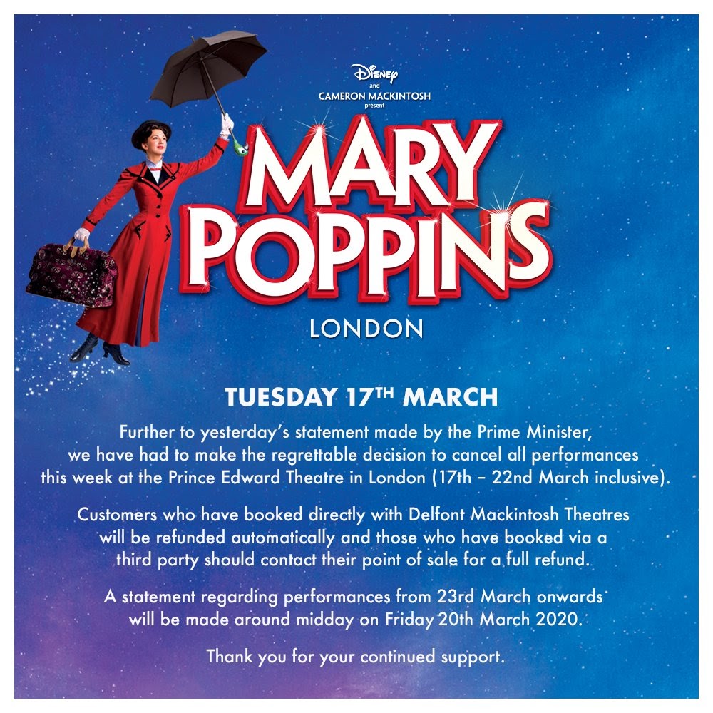 - This morning, Disney Theatrical announced the temporary cancellation of Mary Poppins, playing at the Prince Edward Theater in London since October 23rd, 2019, with a run that is scheduled to go until September 20th, 2020.