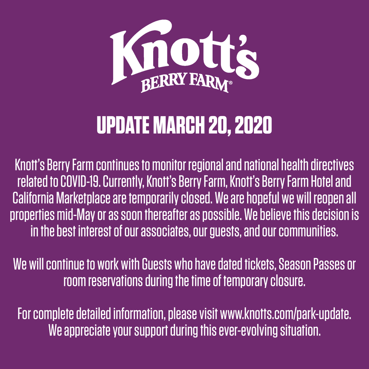 The update from Knott’s Berry Farm and their parent company CedarFair reads: “As we continue to follow regional and national health directives related to COVID-19, we want to provide the latest update regarding our park schedule. Currently, Knott’s Berry Farm, Knott’s Berry Farm Hotel, and California Marketplace are temporarily closed. It is our hope to reopen those properties mid-May or as soon thereafter as possible. We believe this decision is in the best interest of our associates, our guests, and our communities. - We will continue to work with Guests who have prepaid tickets or booked rooms during the time period of our park closure. Additionally, for existing 2020 Season Passholders who are unable to use their pass during our temporary closure, we will extend your pass by the number of days Knott’s Berry Farm is closed. For ticket inquiries, please contact [email protected] or for hotel re-bookings contact [email protected].