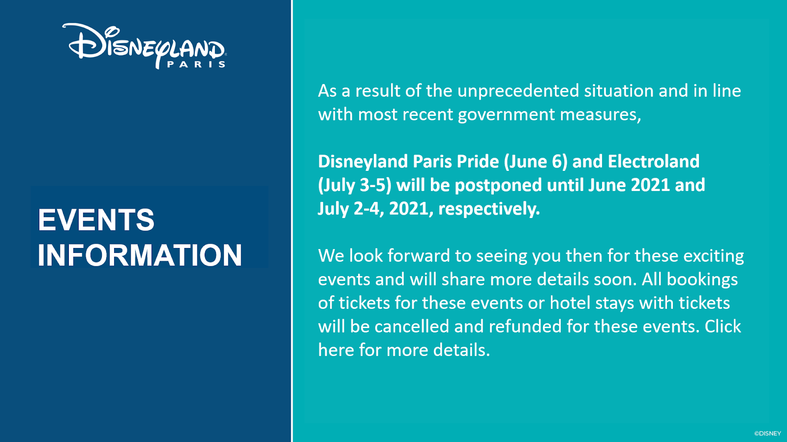 - Disneyland Paris has pushed back two events scheduled in June and July to the same months in 2021.
