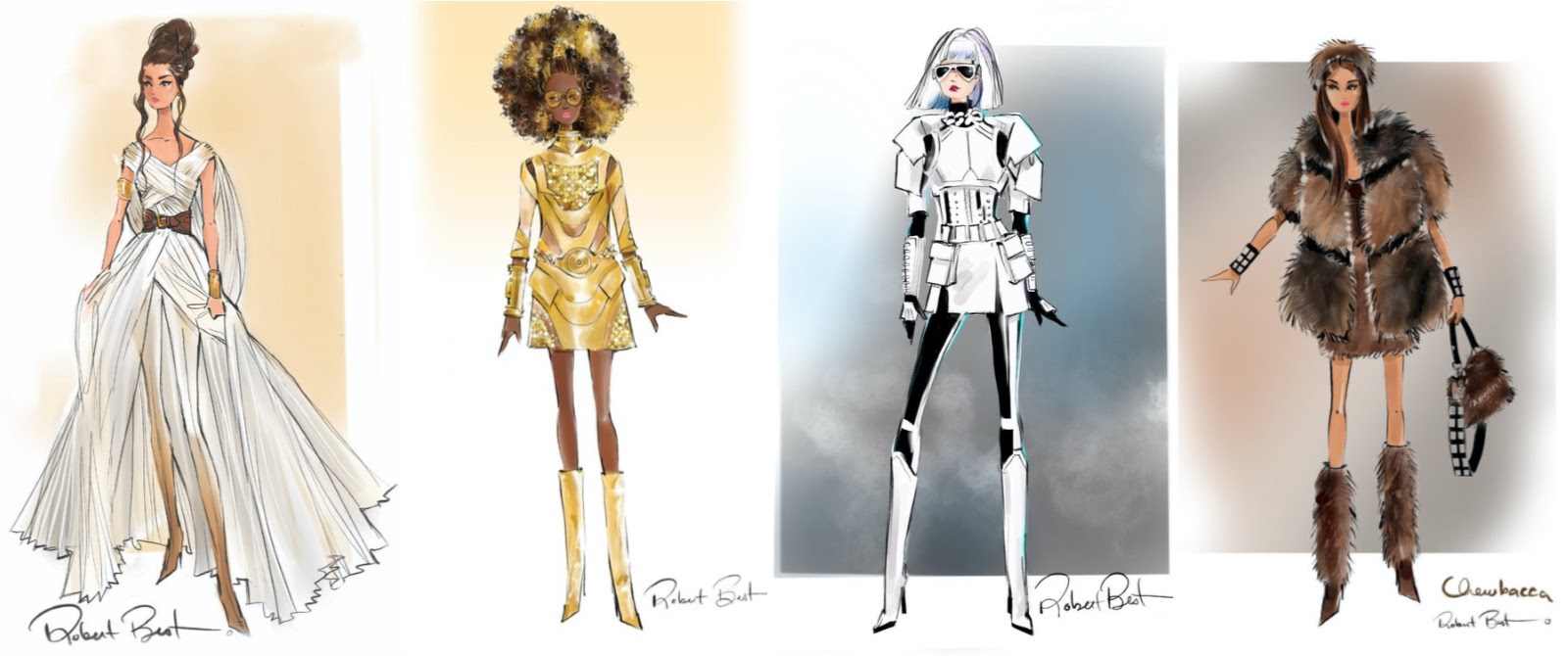 The entire Star Wars x Barbie Collection was designed by Robert Best, Senior Director of Barbie Design. He talked about the new dolls on the official Barbie Blog. "The new series of dolls needed to maintain the same feeling as the first series, but also offer enough new details and surprises to keep fans excited about the new additions. For this second series, I really wanted to push the fashion elements even further. There are amazing shoe designs, great accessories and jewelry that would be at home in a runway show or a high fashion editorial photoshoot.”