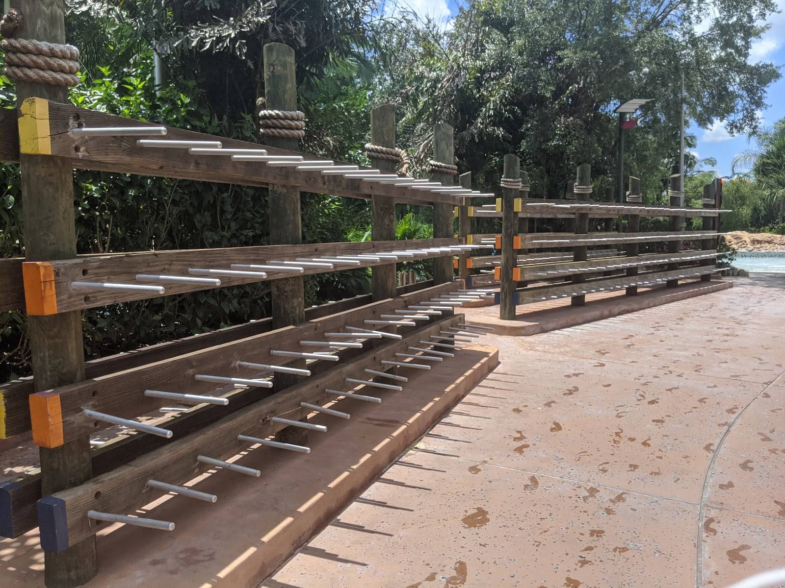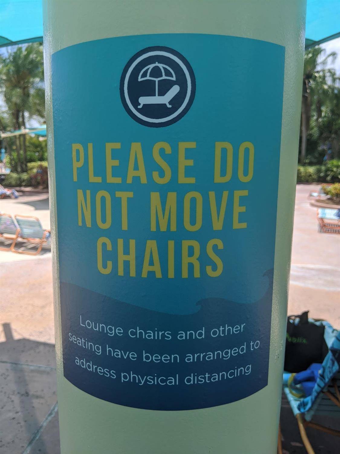 Signage throughout Aquatica reminds visitors to keep 6-feet distance from other parties, such as the sign above where chairs have been spaced out to keep the required amount of distance.