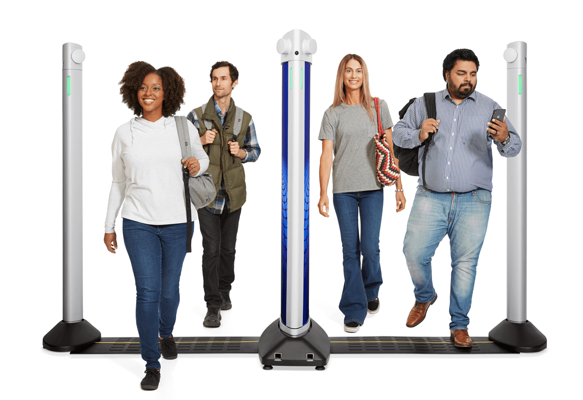 - People walk through between two points, similar to the anti-theft devices at the exit of shops.