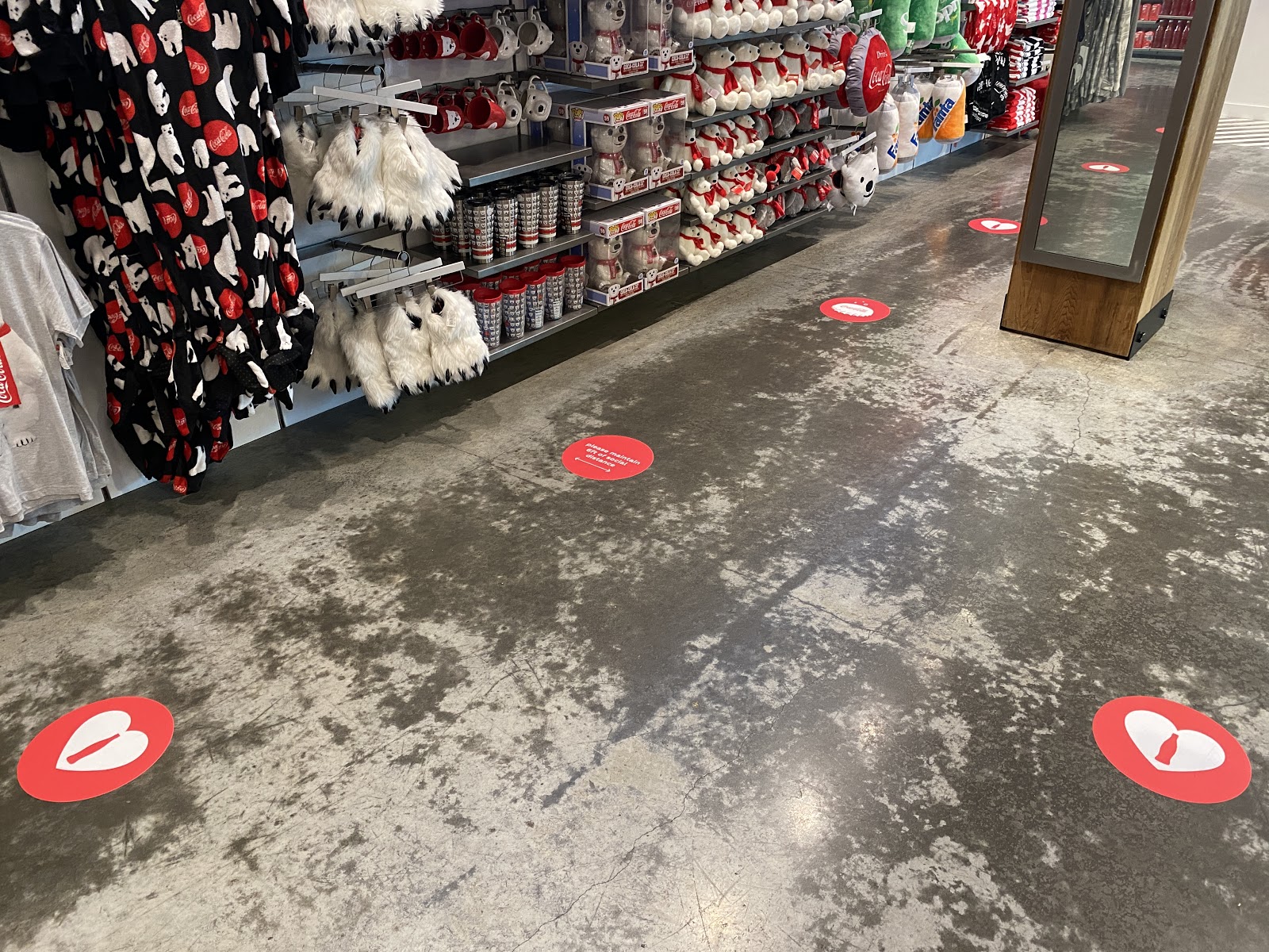 Check-out markers feature Coke bottles in a heart shape spaced six-feet apart.