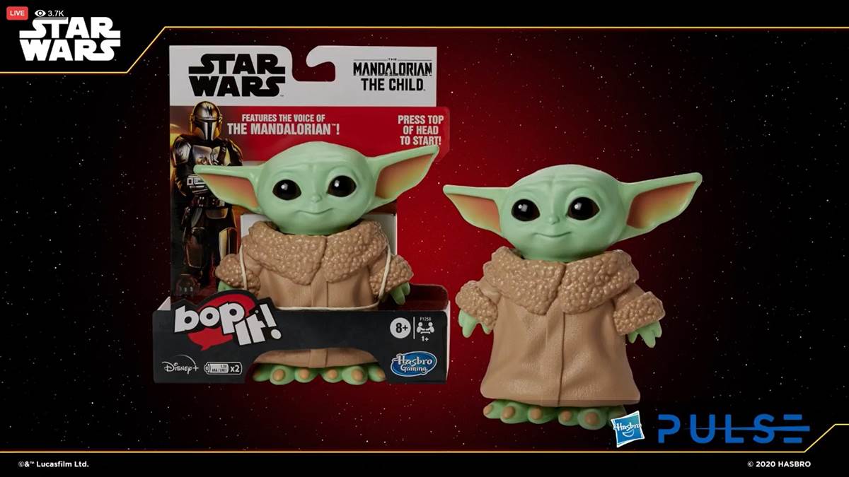 Hasbro also took the opportunity to announce The Mandalorian The Child Bop It!, in which “Players listen to commands made in the voice of the Mandalorian while the giggling bounty makes sounds as you play.” This item will be available exclusively at Wal-Mart this fall.