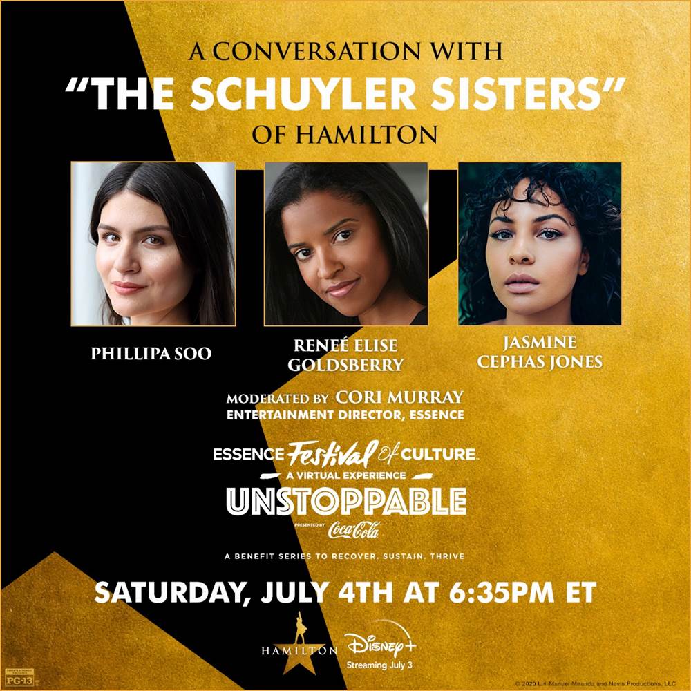 - ESSENCE Festival is reuniting The Schuyler Sisters from the Disney+ version of Hamilton on July 4th at 6:35 pm.